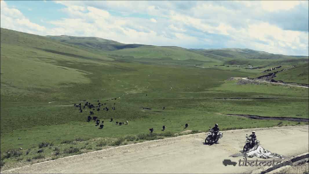 We take the road in a north eastern direction following the Yangtze River through a narrow gorge. 30 kilometers further after passing Derong on tarmac roads the grassland of Sichuan offers great views into wide valleys with herding yaks and nomads. Here we leave the province Yunnan and continue riding in Sichuan. After crossing a pass we will stay in the small Tibetan city of Xiangcheng.
