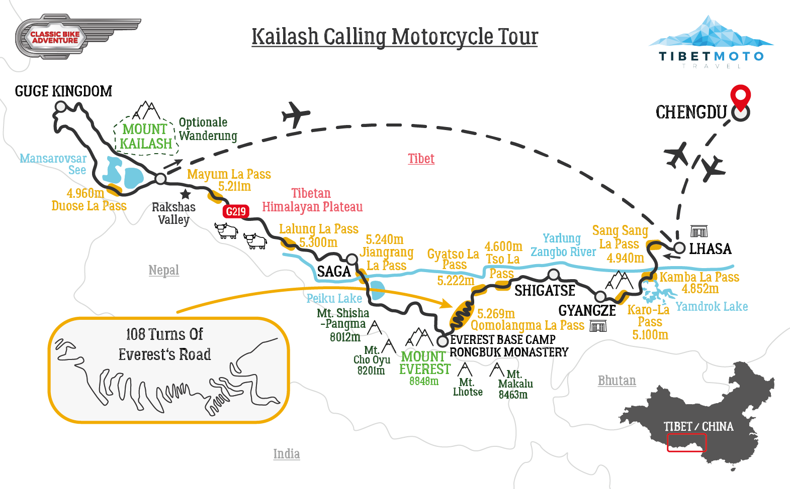 This Tibet motorcycle tour is one of the most spectacular routes in the Himalayas – a journey to the holiest sites, over the highest passes and through the loneliest landscapes on earth. From the historic capital Lhasa with the world-famous Potala Palace and the Jokhang Temple, we start our journey through the highlands of Tibet. Over winding roads and panoramic passes, you will travel along the turquoise blue Yamdrok Lake and on to Gyangze and Shigatse – with visits to impressive monasteries such as Tashilhunpo and Pelkhor. A highlight of the tour is the ascent to Everest Base Camp, which we reach via a breathtaking serpentine road with a view of several eight-thousanders. We spend the night directly at the Rongbuk Monastery with a view of the highest mountain in the world. It gets even more remote on the way to the holy lake Manasarovar and Mount Kailash, which is considered the center of the world for millions of pilgrims.